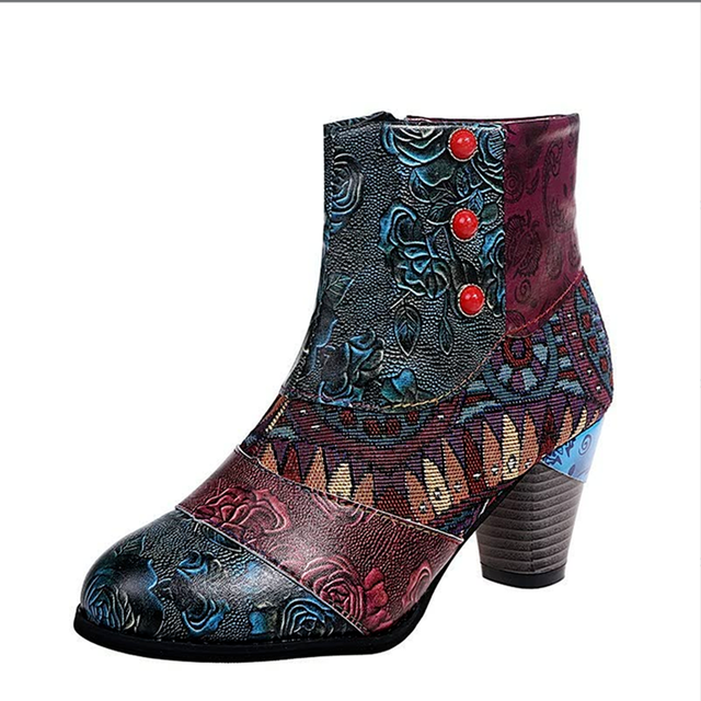 Women Shoes Splicing Printed Ankle Boots for Female PU Leather Retro Block High Heels Bohemian Ladies Spring Autumn Short Boots