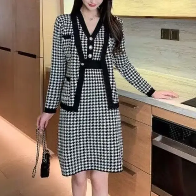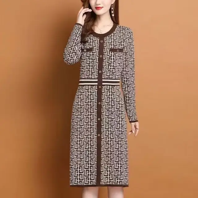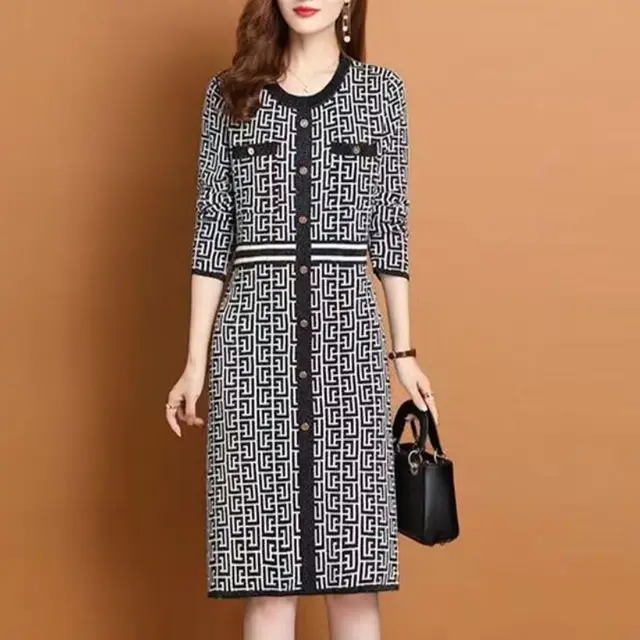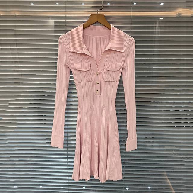 Women’s Pink Knitted Medium-Length Dress Senior Sense Of Fashion Temperament Waist-Skimming Long Dress