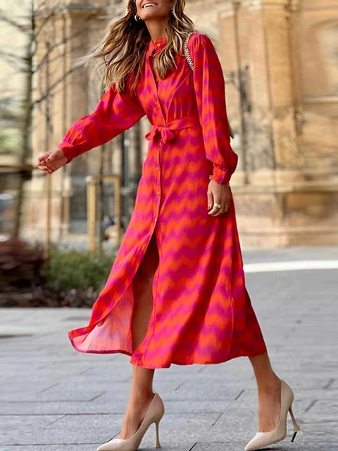 Price range: $44.64 through $64.64Daily Stand Collar Sleeve Button Knotted A-Line Midi Dress Casual Fashion Female Loose Sundress Lady