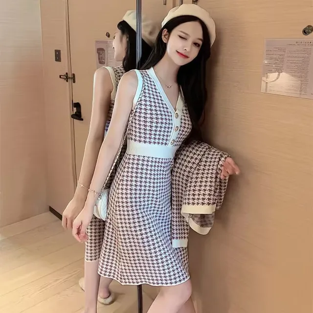 Women Two Piece Set Fall Knit Sweater Cardigan and Sleeveless Halter Dress Piece Sets Women