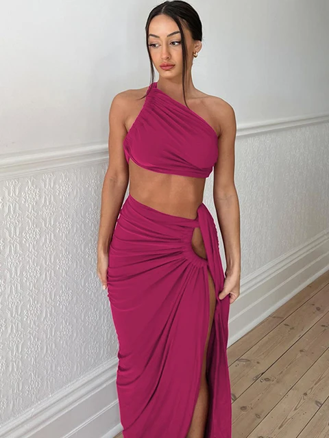 Hollow Out Bandage Split Maxi Dress Set Women Sleeveless One Shoulder Ruched Crop Top Long Skirts Sets