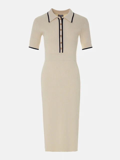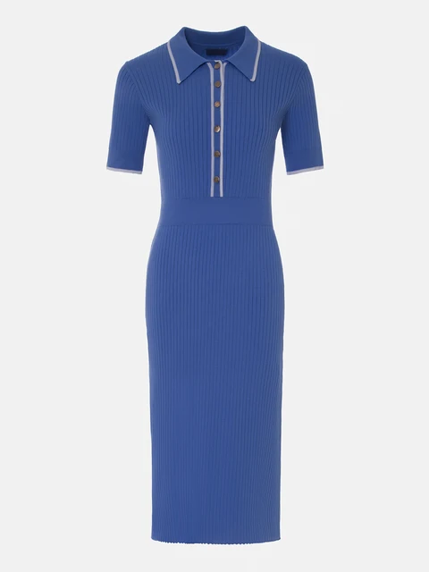 Knitted Midi Dress Contrast Color Summer Women Polo Collar Button Short Sleeve Bodycon Dress Lady Elegant Party Evening Dresses