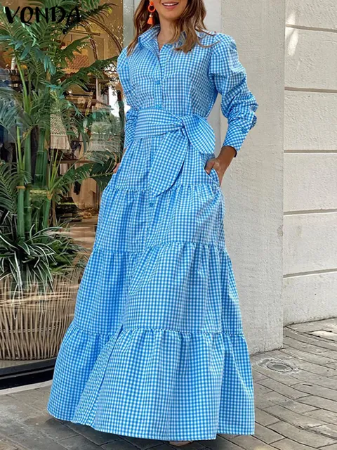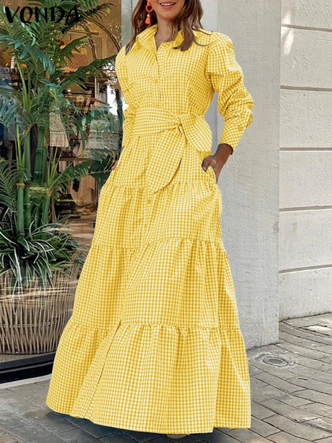 Women Bohemian Plaid Shirt Dress Autumn Long Sleeve Party Sundress Casual Lapel Button Vintage Belted