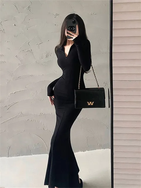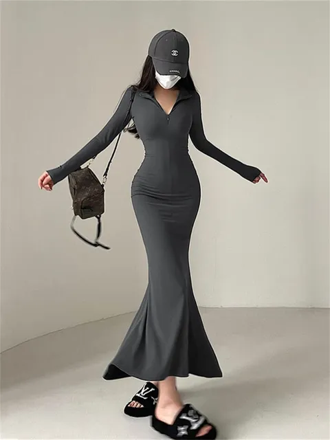 Women Spring Autumn Style Long Sleeve Zipper Collar Mermaid Dress
