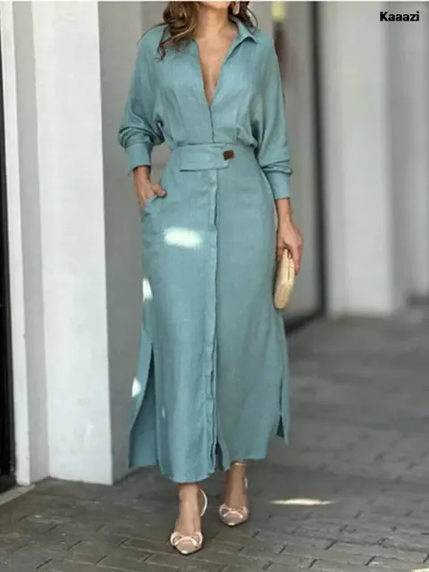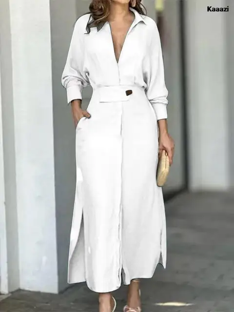 Fashion Maxi Dress Women Elegant Solid Color Evening Dresses Work Split Chic Long Sleeve Clothes Office