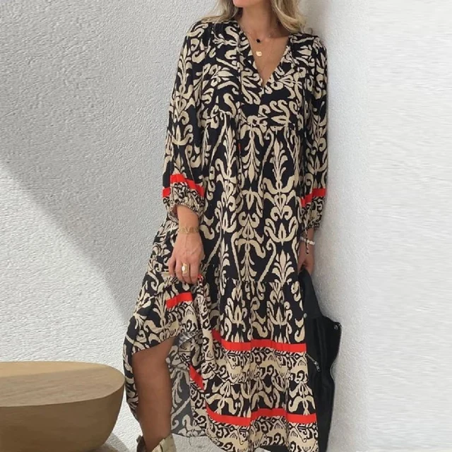 Women Vintage V Neck Paisley Flower Print Knotted Cut Casual Midi Dress Female Chic Hollow