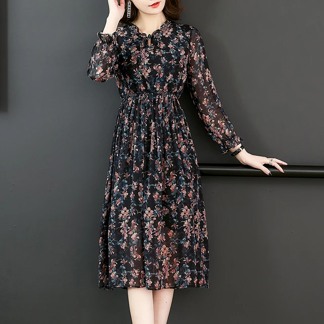 Fashion Silk Printed Dress Women’s Summer Vintage Silk Long Sleeve Loose Fit Casual Holiday Dress