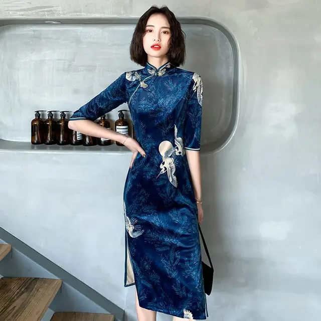 Cheongsam Modern Long Sleeve Qipao Dress Traditional Red Blue Dress for Women