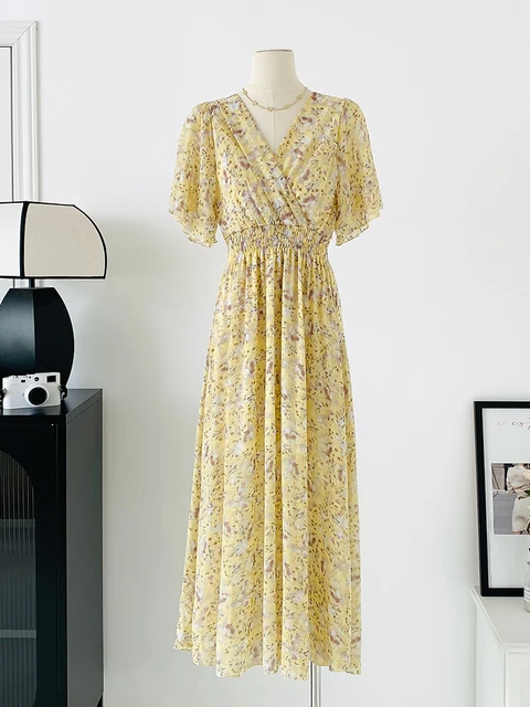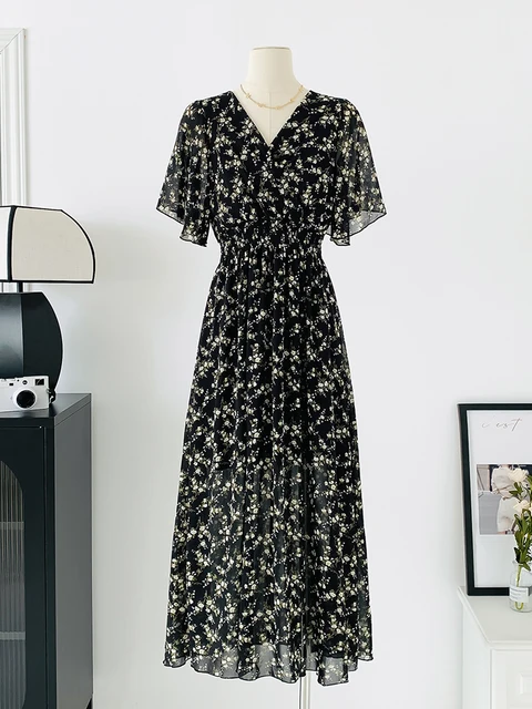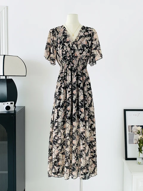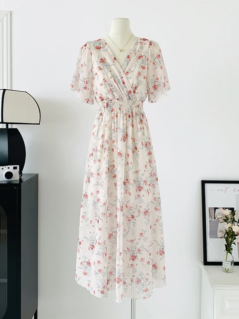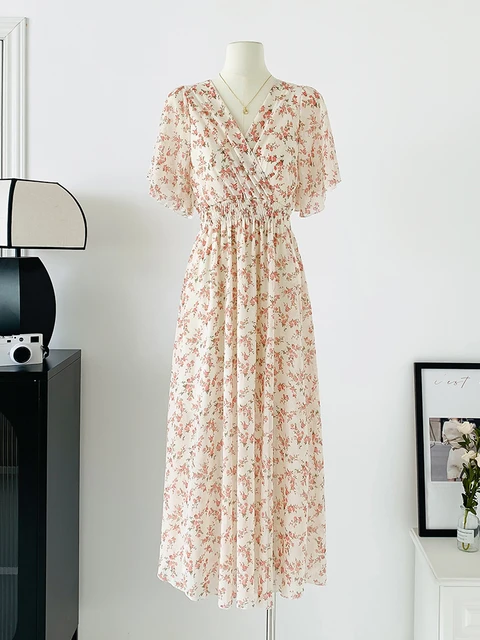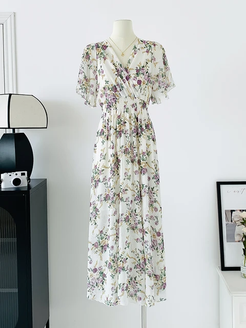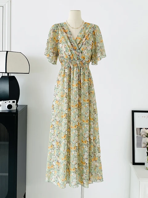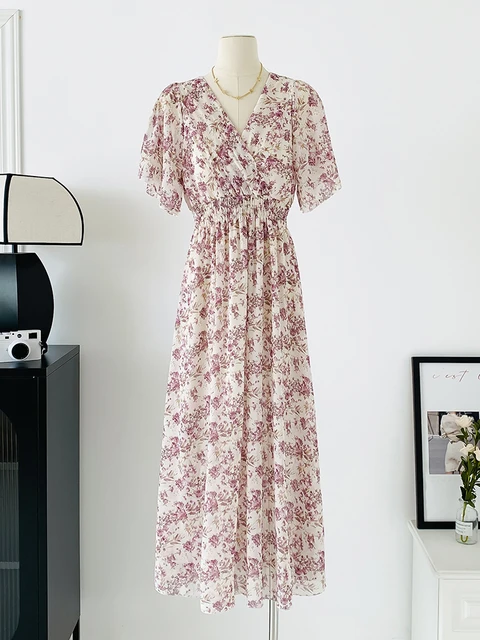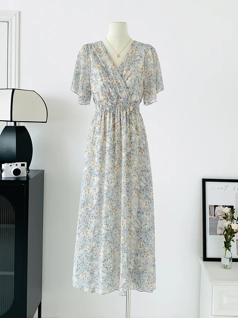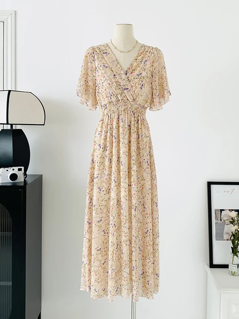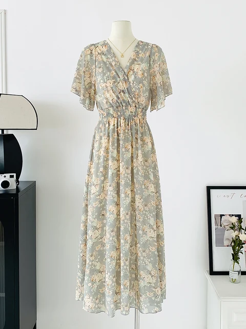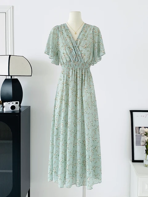 Women Elegant Dress V Neck Solid Color Short Sleeve Chiffon High Waist Closing Evening Breathable Soft Ankle Length Dress Gown