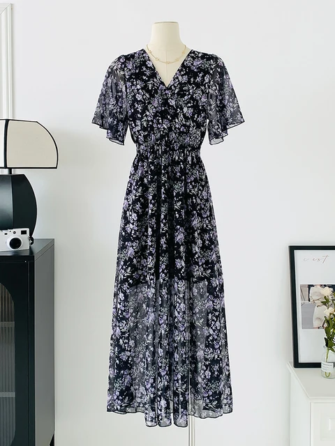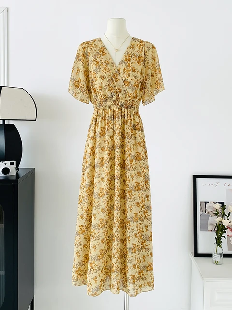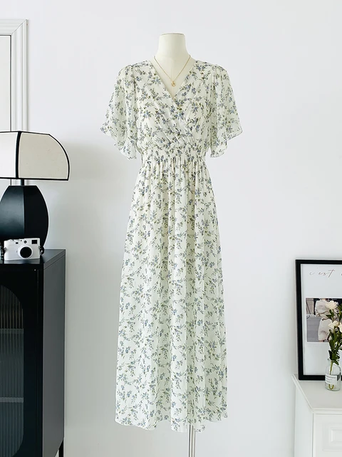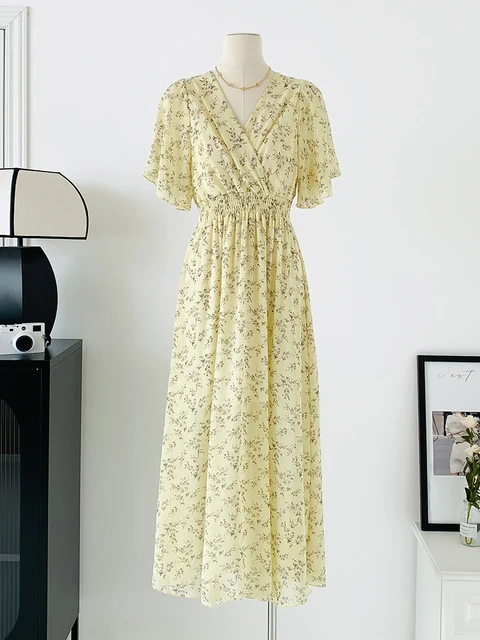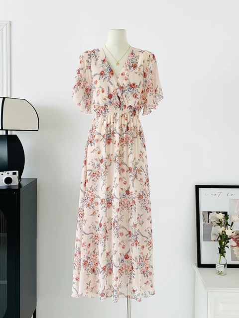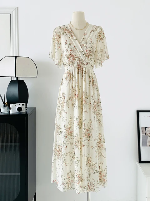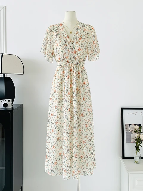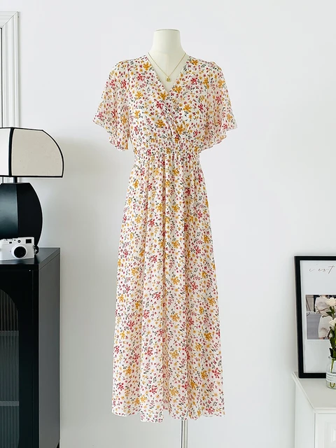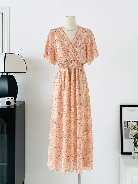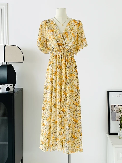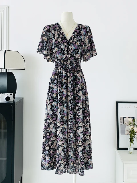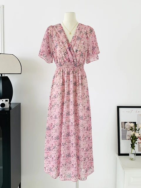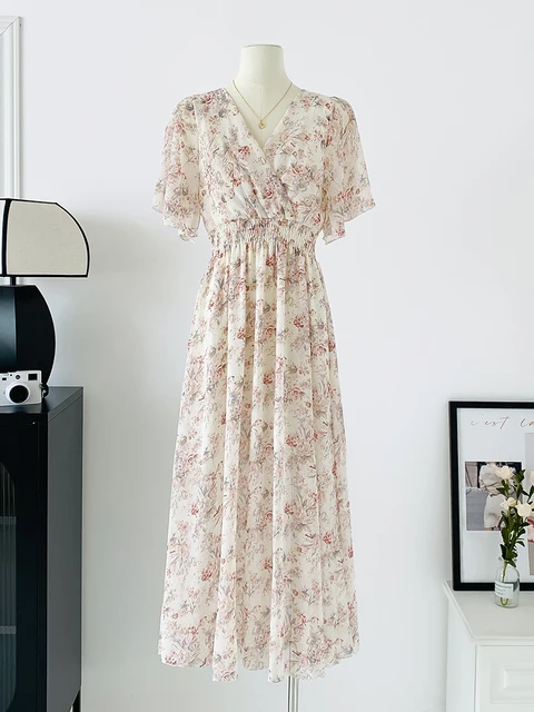 Women Elegant Dress V Neck Solid Color Short Sleeve Chiffon High Waist Closing Evening Breathable Soft Ankle Length Dress Gown