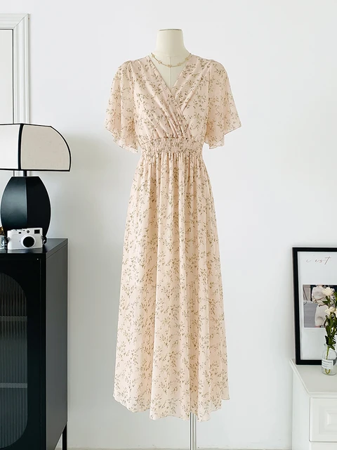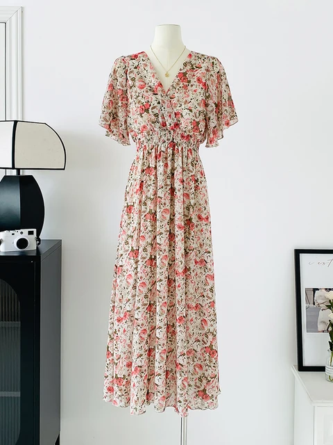 Summer Women Midi Dress V Neck Batwing Short Sleeve Pullover Mid-length Women’s Dresses