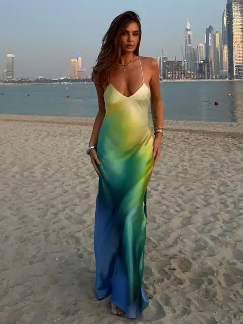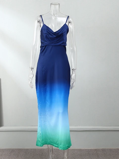 Women Gradient Slim Sling Dress Swing Collar Sleeveless Backless High Waist Long Dresses Fashion Lady Night Party