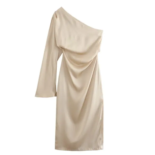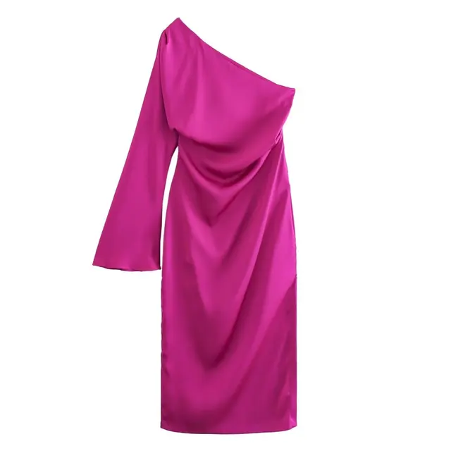 Single Shoulder Asymmetrical Midi Dress Female Chic Flare Sleeve Side Zipper Pleat Casual Split