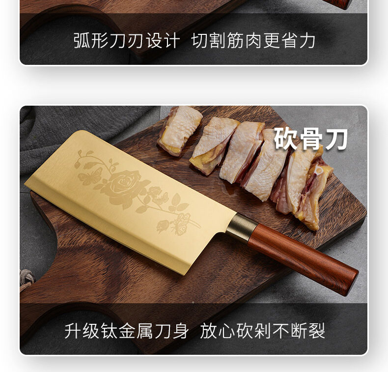 1. Durable sharp, wear-resistant and durable: Thanks to advanced titanium technology, the blade of these kitchen knives has extraordinary hardness and wear resistance, which can maintain long-term sharpness, even in the face of hard ingredients such as bones and root vegetables, which can be easily dealt with, greatly reducing the need for frequent sharpening.