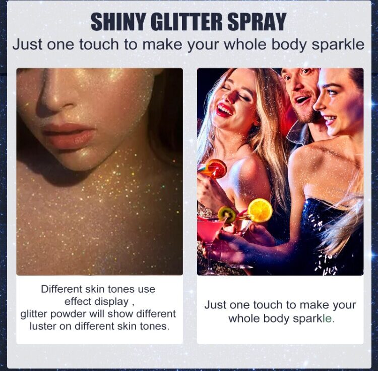 Usage tips: Please keep a distance of 30-50 cm from your skin for better coverage of the glitter spray.