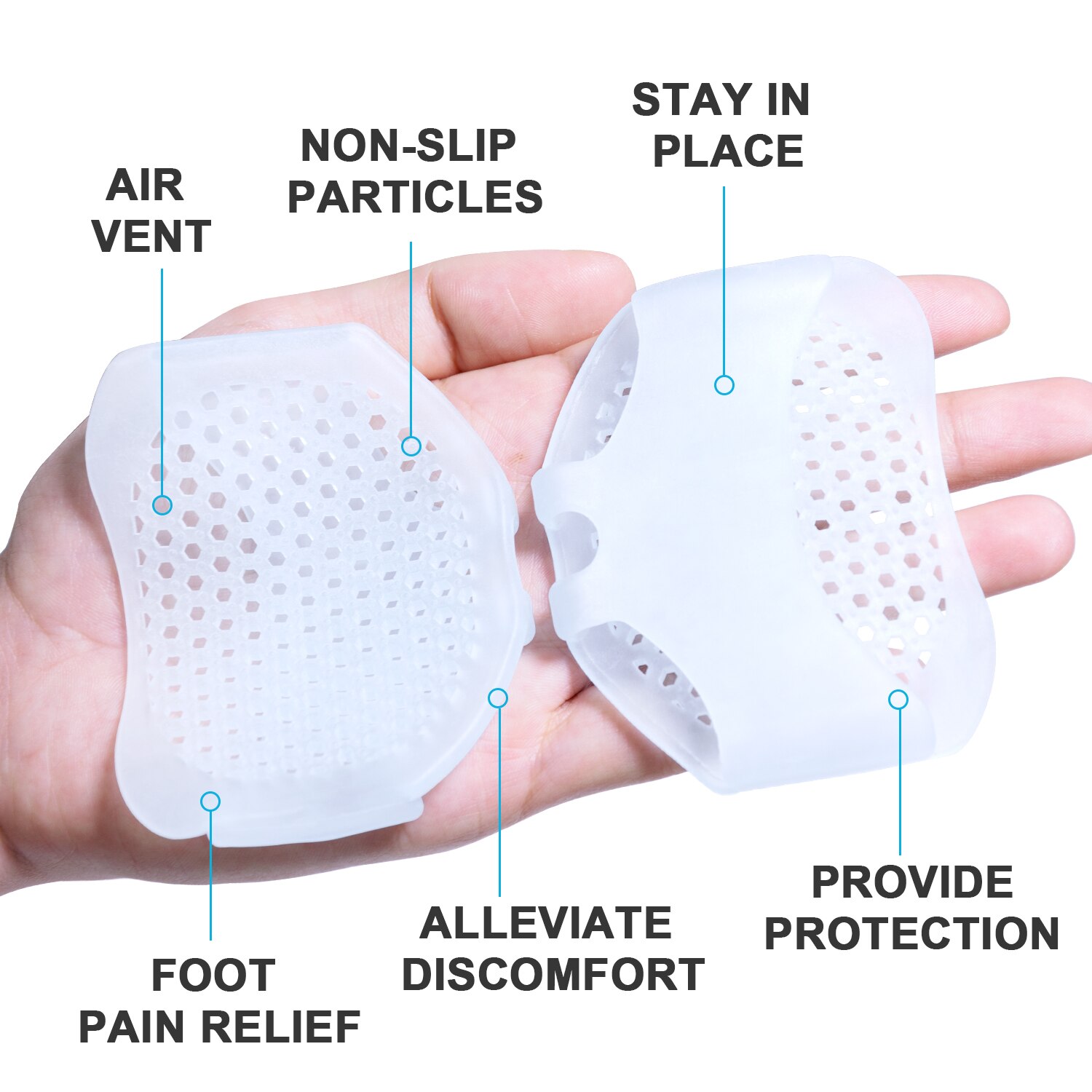 1.These ball of foot cushions slide over the middle toes and stay in place over the footpad to provide squishy, hypoallergenic, odor-resistant comfort.